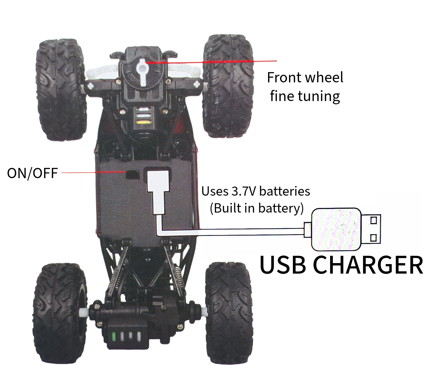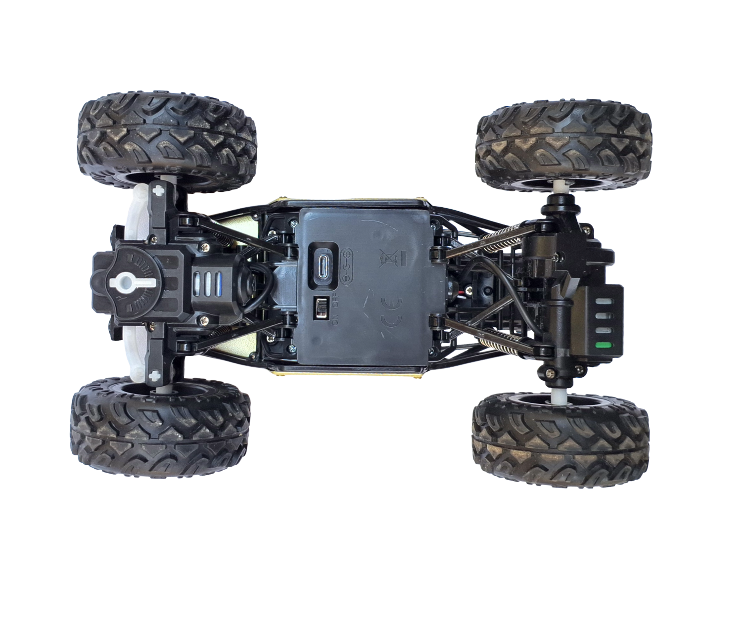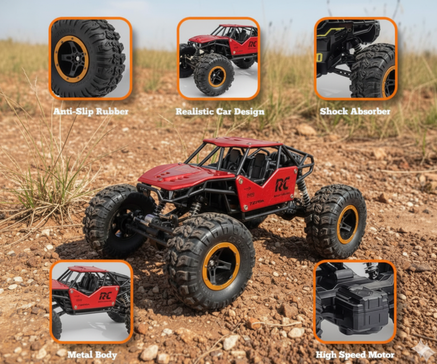 Off-Road Monster Design: Big grip tires and shock-absorbing suspension for rocky, sandy, or grassy surfaces.